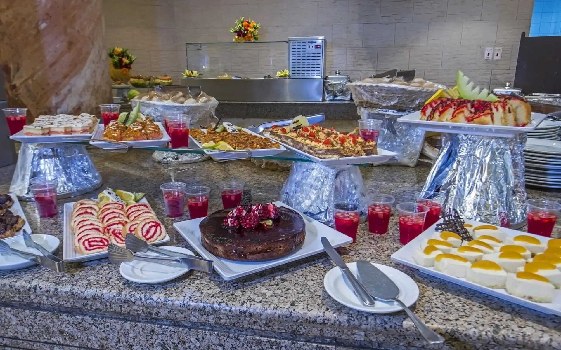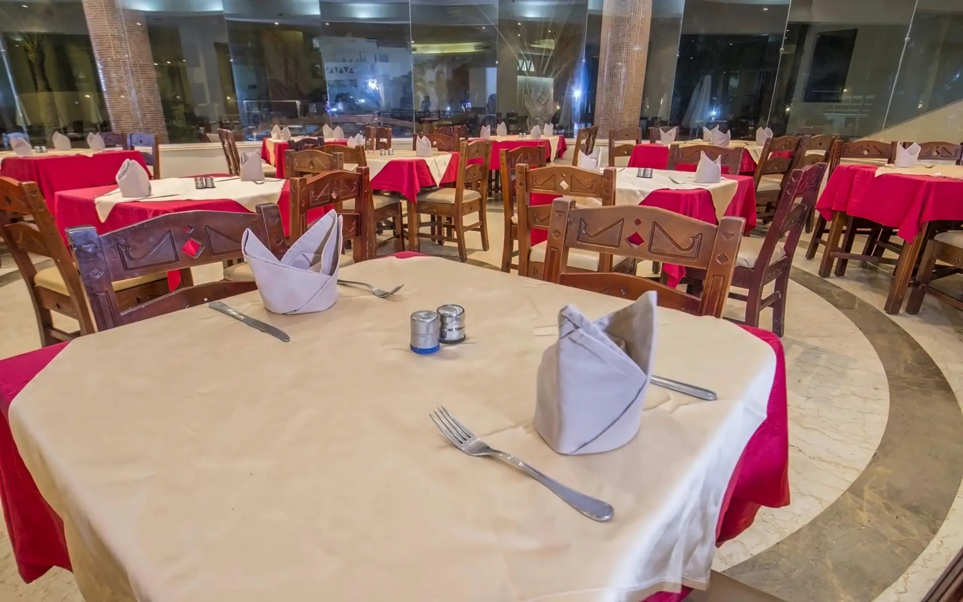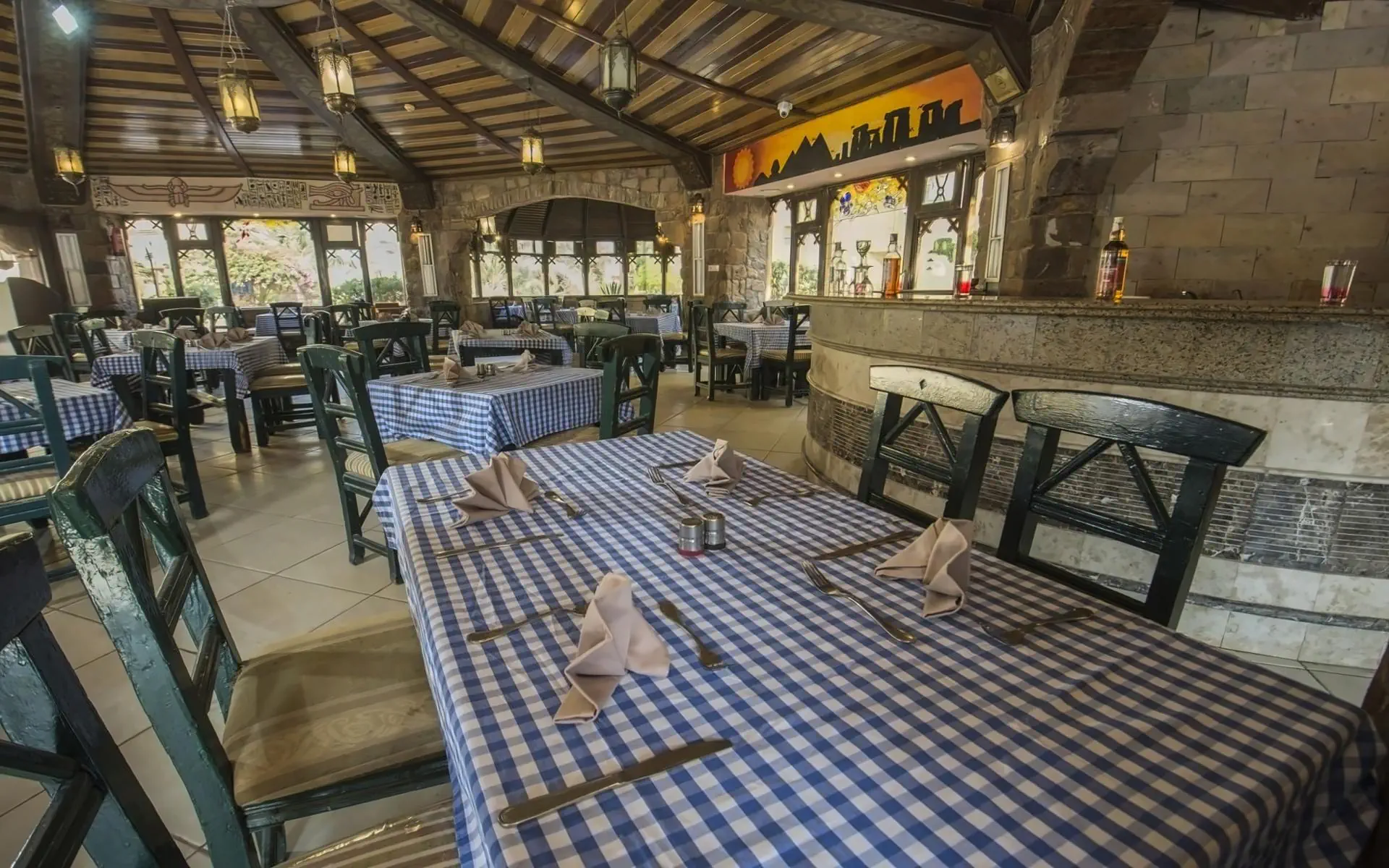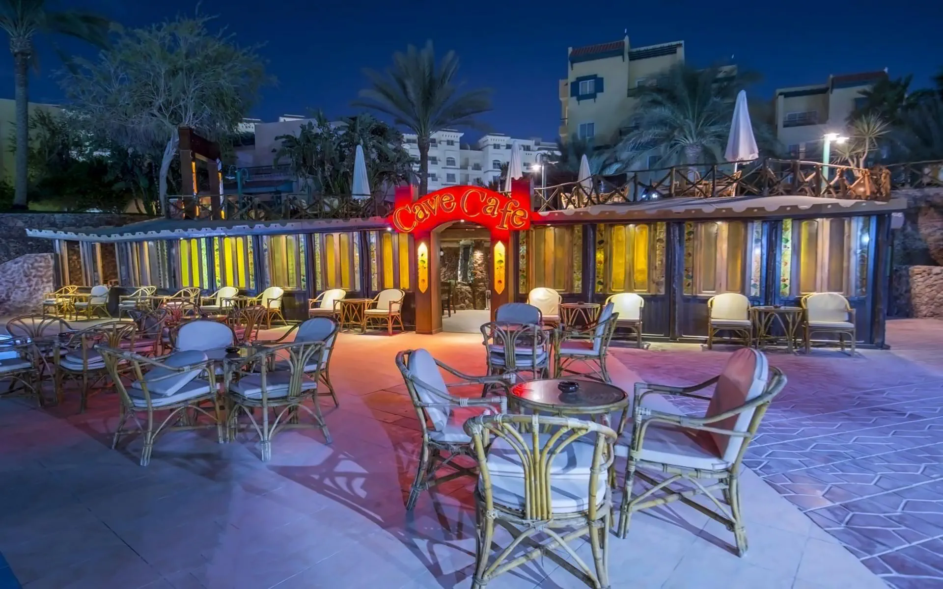* HBśniadanie z napojami (herbata, kawa, woda) oraz kolację (wszystkie napoje dodatkowo płatne). * Aii Inclusive (od 10:00 do 22:00)posiłki * śniadanie * lunch * kolacja * napoje * lokalnie produkowane napoje bezalkoholowe i alkoholowe * Wszystkie napoje podawane są w szklankach, jedna na zamówienie. * Napoje butelkowane dostępne są tylko za dodatkową opłatą (w tym woda). * Wino podawane jest tylko podczas lunchu i kolacji w restauracji głównej. * Menu dla dzieci - opcje w menu ogólnym. * Restauracja główna pracuje według systemu - bufet, kuchnia - międzynarodowa. Godziny pracy:śniadanie 07:00 - 10:00 * lunch 13:00 - 15:00 * kolacja 19:00 - 22:00 * Alya-carte w hotelu nie ma restauracji. * Bary:Cave Cafe - lobby bar, czynny od 10:00 do 22:30 zgodnie z systemem All inclusive * Beach bar - bar na plaży czynny od 10:00 do 18:00 zgodnie z systemem All inclusive. * Beduin tent - kawiarnia orientalna, bar z sziszą za dodatkową opłatą.